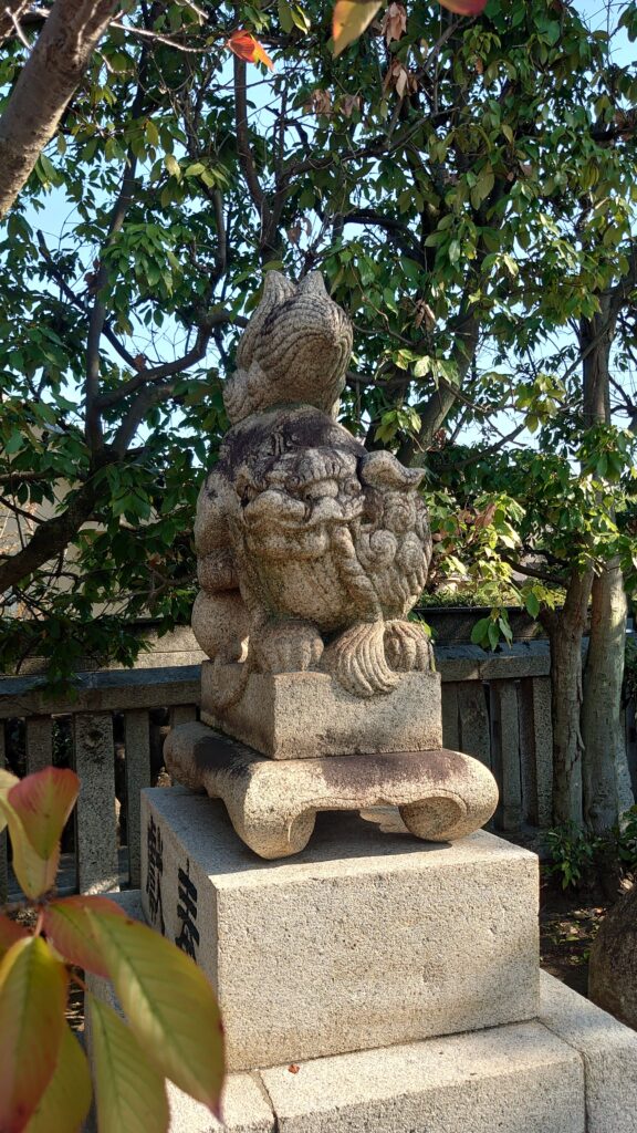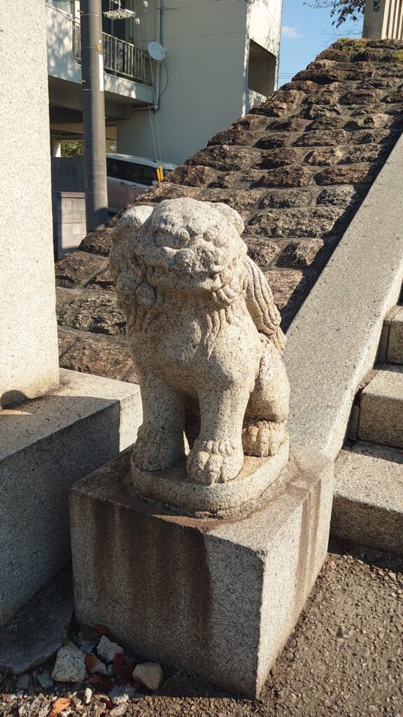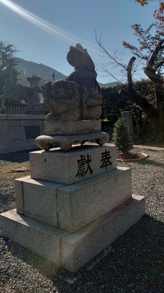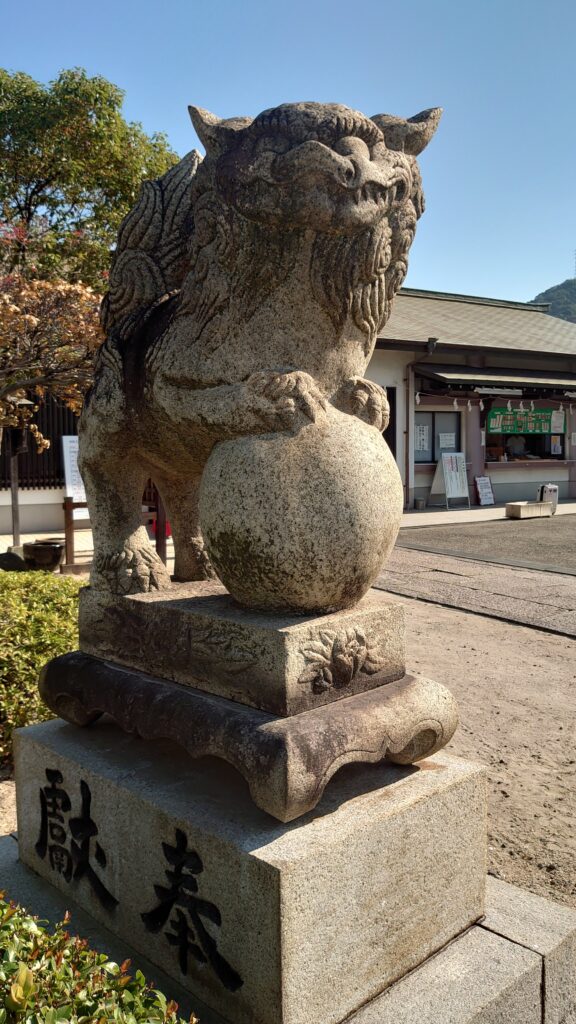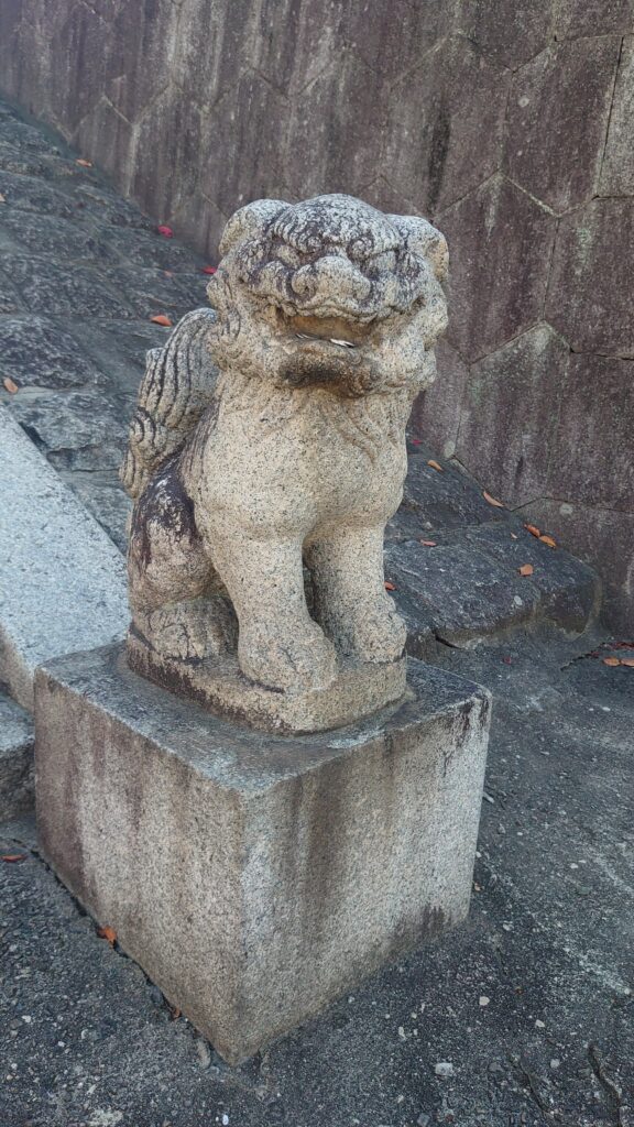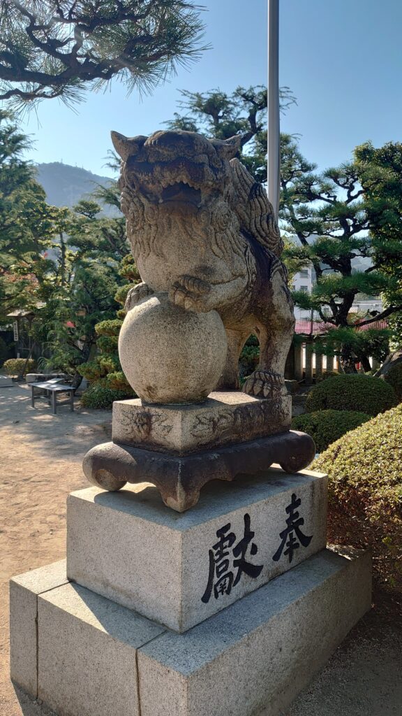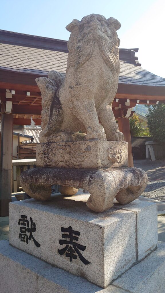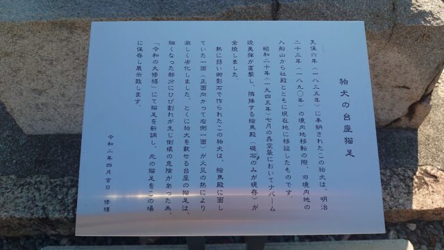 昭和20年7月、太平洋戦争における呉空襲で、当時あった絵馬殿にナパームが直撃し、近くにあったこの狛犬の右側が熱によって激しく劣化。その際に台座の猫足にひび割れが生じ、倒壊の危険があったため新たに新調した、ということです。
