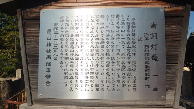 これがなかなか凄くて、安永8年(1779)に尾張の8代目藩主・徳川宗睦より上野の寛永寺に奉献された2基のうちの1基で、以後、大事にされながら数々の人の手に渡り、亀山神社再建に際して無事に完成するようにという願いと共に奉献されたという代物。