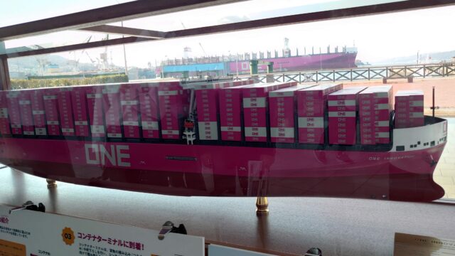 これは私も初めて知ったのですが、2018年4月に日本郵船、商船三井、川崎汽船の日本の3社の船会社それぞれが持つ定期コンテナ船の事業を統合して開業した「Ocean Network Express(オーシャンネットワークエクスプレス)」というコンテナ船会社のものです。