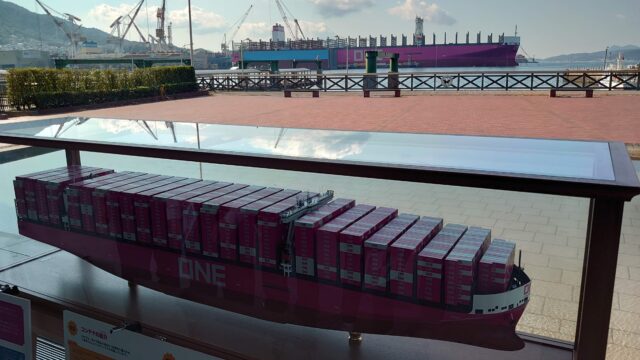 窓際にあるこのピンクのは?と思ったら、これは大型コンテナ船「ONE」でした。