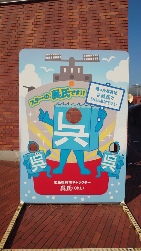 呉市を徹底的にアピールするためだけに生まれてきたキャラクター。顔が、名前が、そのまま市名になっている。背中にも読みの「クレ」を背負って、しつこいくらい「呉」をアピール。