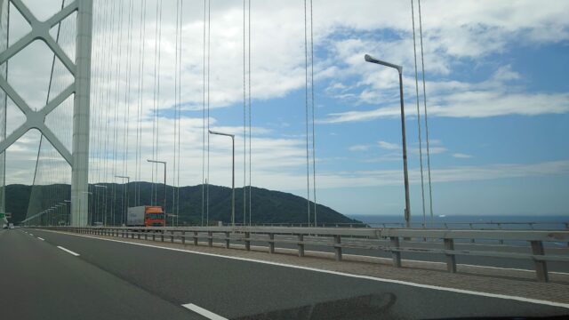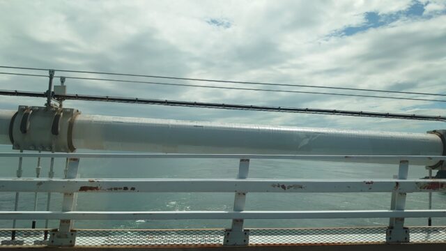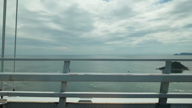 あの白波が立ってる箇所がきっと渦潮だと思うけど、運転しながらであまりよそ見もできないし、なんなら橋の欄干と重なっててよくわかんない!