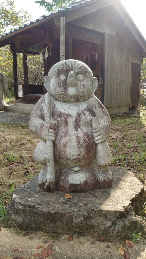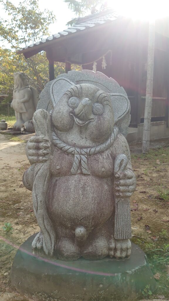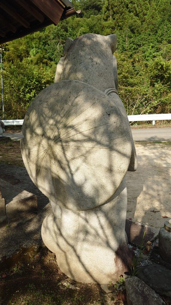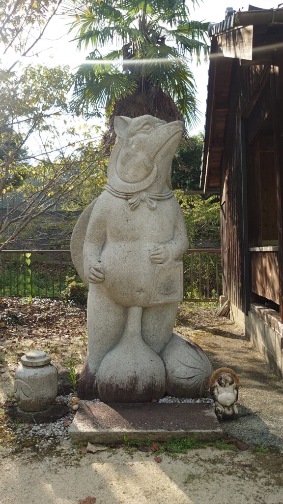 『平成狸合戦ぽんぽこ』で隠神刑部は犬に近い風貌で描かれていますが、こちらの石像もそれに寄せたのか、逆にジブリがこっちに寄たのか、犬っぽい風貌の石像となっています。