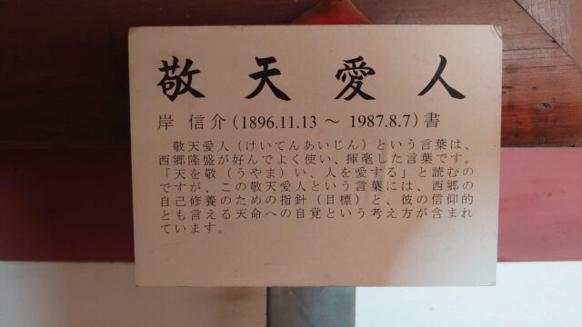 西郷隆盛が愛した言葉で、「天を敬い、人を愛する」と読みます。