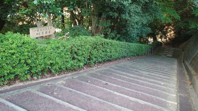 本殿の背後は駐車場になっているのですが、その片隅に下へ降りる階段がありました。