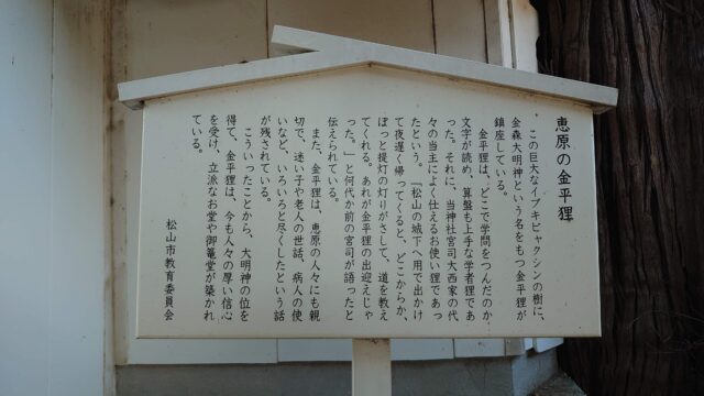金平狸は、どこで学問をつんだのか文字が読め、算盤も上手な学者狸であった。それに、当神社宮司大西家の代々の当主によく仕えるお使い狸であったという。「松山の城下へ用で出かけて夜遅く帰ってくると、どこからか、ぽっと提灯の灯りがさして、道を教えてくれる。あれが金平狸の出迎えじゃった」と何代か前の宮司が語ったと伝えられている。