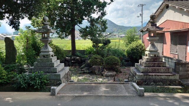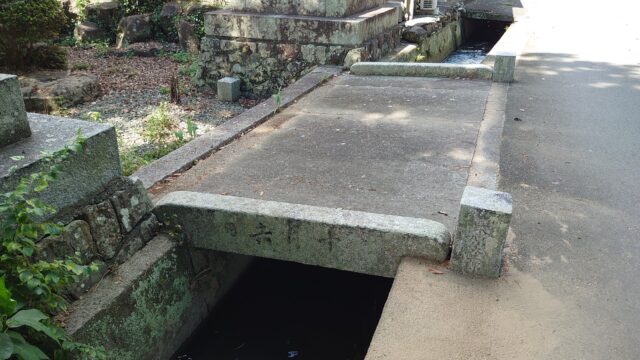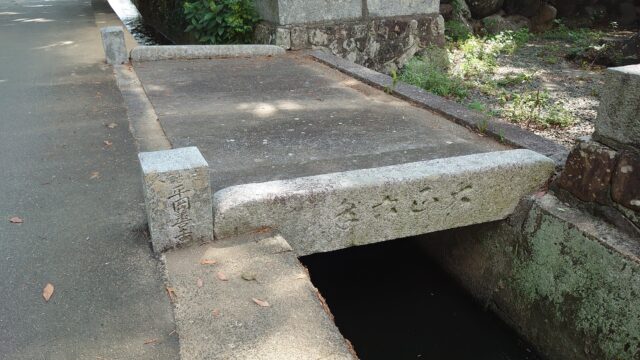 楼門から道路を挟んだ向かいには、用水路と小さな橋、一対の石灯籠があります。
