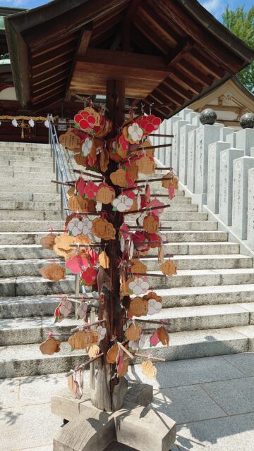 拝殿への階段下に、椿の形の可愛い絵馬がたくさん掛かっていて、風に揺れてカラカラといい音が鳴っていました。