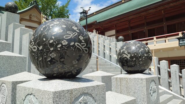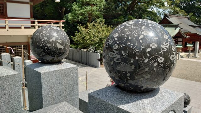 その階段の真ん中と両脇に建てられた石柱の上に乗っている黒い玉の柄をよーく見たら、ひとつずつに干支の絵が掘られていました!