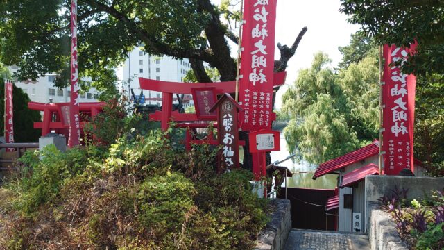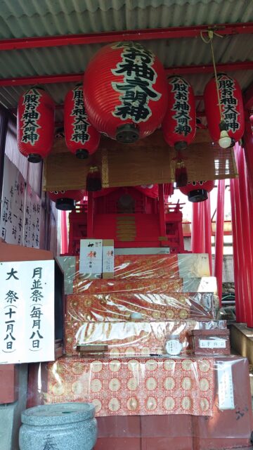 その句碑の並びに目立つ朱色の鳥居、こちらが八股榎お袖大明神。