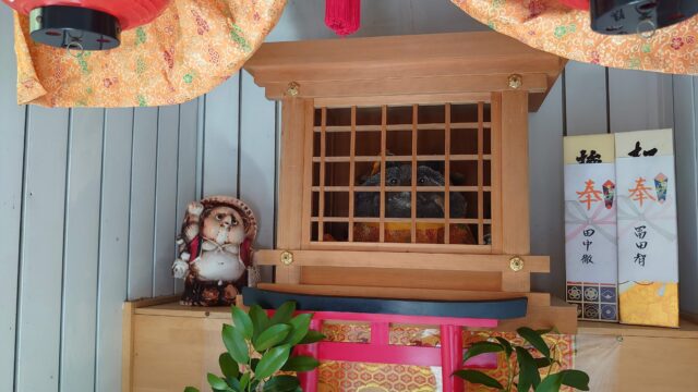 「中のお狸さんの写真は撮っても大丈夫ですか?」と伺うと、「どうぞ。写真を撮るときは澄まし顔になりますよ(笑)」と。