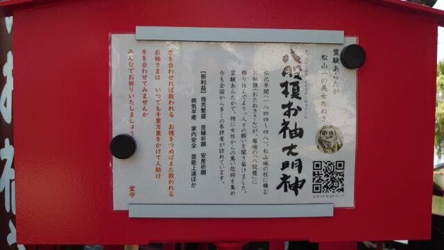 弘化年間(1844〜48)、松山城の杜に棲むお袖狸(おたぬきさん)が、堀端の「八股榎」に移り住んでより、人々の願いを聞き届けました。霊験あらたかで、特に女性からの篤い信仰を集め今も全国から多くの参拝者が訪れています。