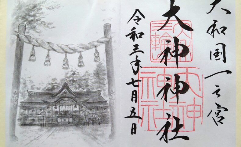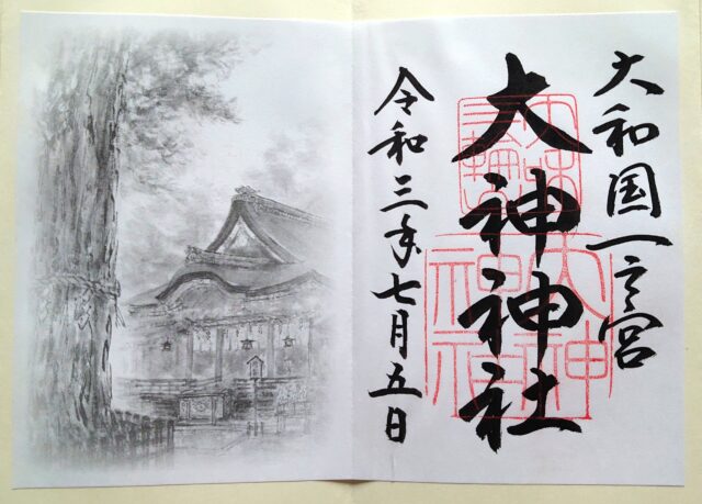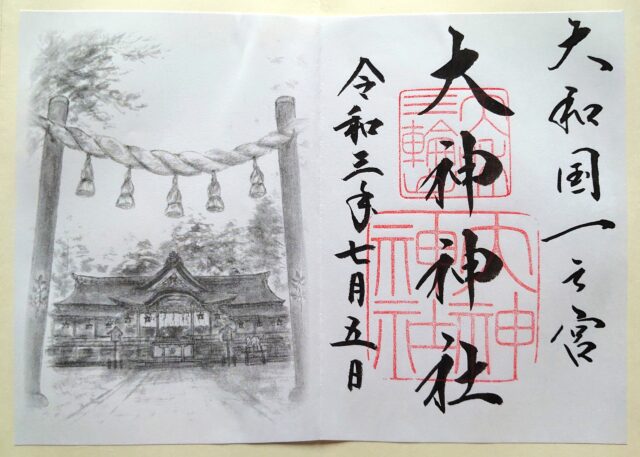 予めこの日本画が描かれているものの右側に、「大和三輪山」と「大神神社」の朱印を捺して、「大和一之宮 大神神社」の文字と日付を入れてくれます。